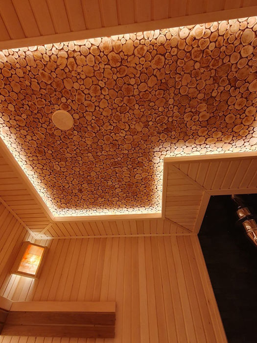 Робимо гідроізоляцію і теплоізоляцію на стінах і стелі, встановлюємо пічку і трубу, монтуємо деревину на стелю і стіни